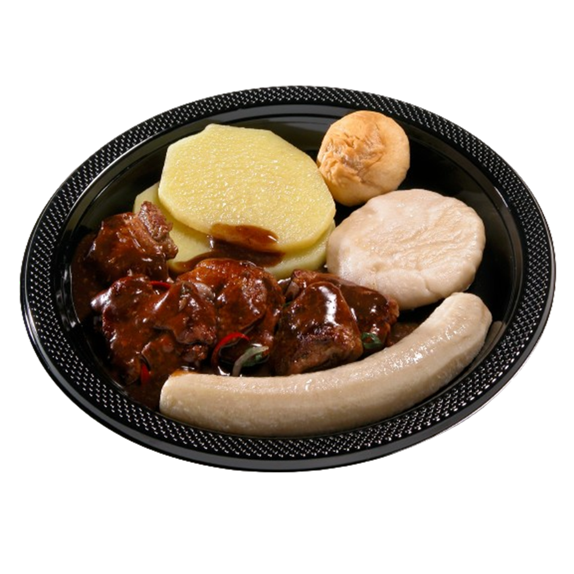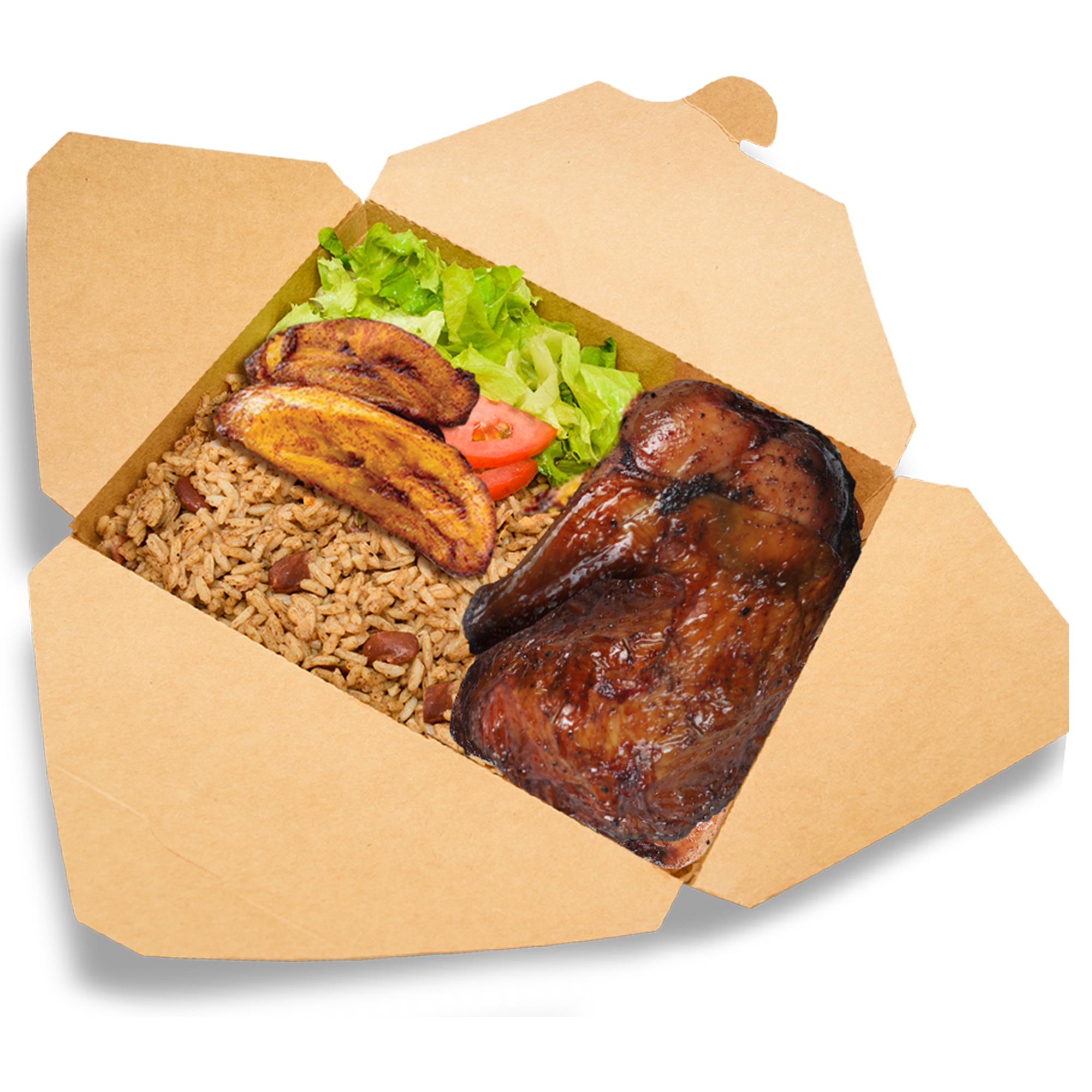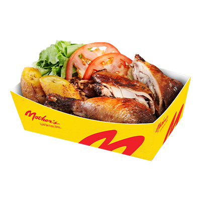 6 pieces chicken, two 12 oz rice & peas, 3 pcs of ripe plantains,